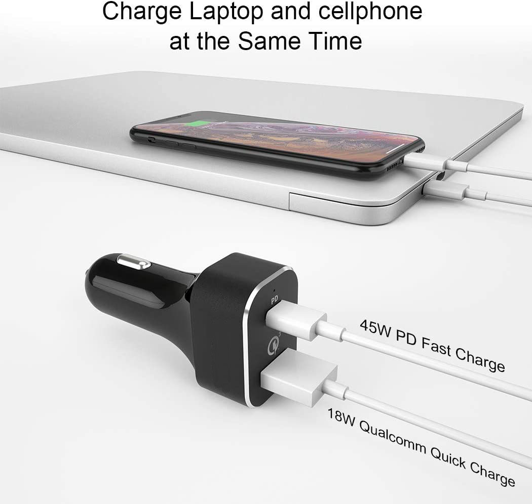[63W High Speed Charging]: 45W PD port fast charges the latest USB-C devices, including iPhone 11 and Macbook Air. QC3.0 ports output with 2.4A, with 18W output power, makes it four times faster than the other car adapters in the market!